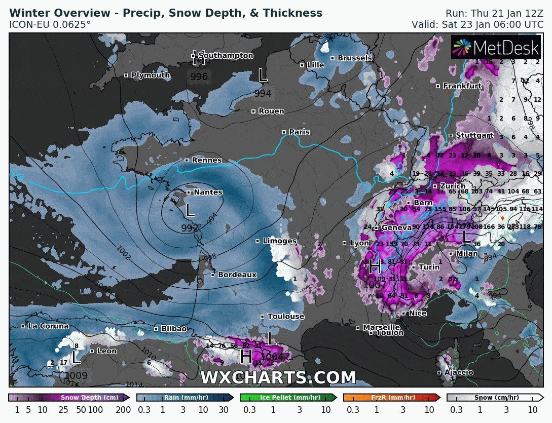 Animation des précipitations du samedi 23 au lundi 25 janvier 2021 (bleu = pluie / blanc = neige) - via wxcharts.com