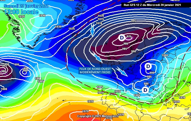 Ainsi, le flux jusqu'alors orienté au secteur sud-ouest à ouest s'orientera au nord-ouest ce week-end. Il apportera un air plus froid venu des Îles Britanniques en provenance de Mer de Norvège. Comme ce flux conservera une origine maritime, le froid restera modéré mais il pourra suffire à l'observation de précipitations hivernales sur le nord et l'est, là où les températures en altitude seront les plus basses.