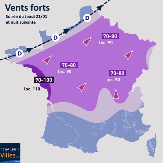 Ce fort coup de vent se prolonge en soirée du 21 janvier et en cours de nuit avec des rafales de l'ordre de 70 à 90 km/h encore attendues du centre-ouest jusqu'au le nord-est en passant par les régions centrales, dont l'Île-de-France. La prudence reste de mise sur ces régions où l'atténuation sensible des vents interviendra surtout en fin de nuit.