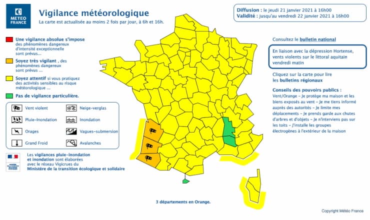 Carte de vigilance en vigueur le jeudi 21 janvier 2021 à 16h - via Météo France
