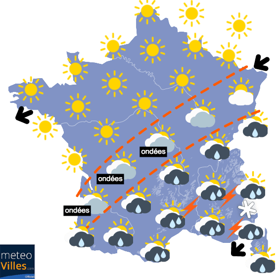 Cet écart entre Nord et Sud sera observé durant les journées de Lundi et Mardi, avec des minimales fraîches au Nord (restant hors gel grâce au vent), mais plus douces qu'au Sud en journée. Globalement, les conditions seront très ensoleillées notamment au Nord de la Loire alors qu'il faudra composer avec les nuages, la pluie et une fraîcheur diurne au Sud, notamment dans le Sud-Est.