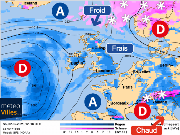 - L'absence d'anticyclone solide sur l'Europe et la Méditerranée. Dans ces conditions, les dépression peuvent circuler librement en Europe. La chaleur reste très en retrait sur le Sahara.