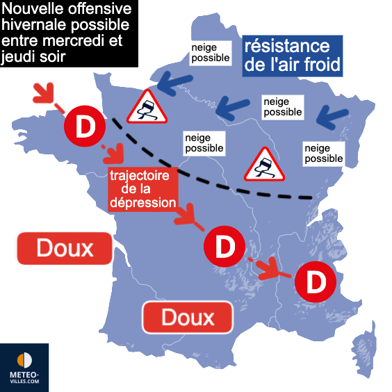 Après le redoux de dimanche après-midi, l’air froid reprendra rapidement le dessus sur la moitié nord dès le début de la semaine. Une dépression, déviée vers le sud par l’air froid persistant au nord, devrait s’échouer sur la France entre mercredi soir et jeudi. Les précipitations, sous cet air froid, pourraient se transformer en neige. Il est cependant encore trop tôt pour déterminer précisément les régions concernées. Des chutes de neige significatives sont possibles, avec un risque accru entre la Normandie, l’Île-de-France et toutes les régions situées au nord de la Seine.