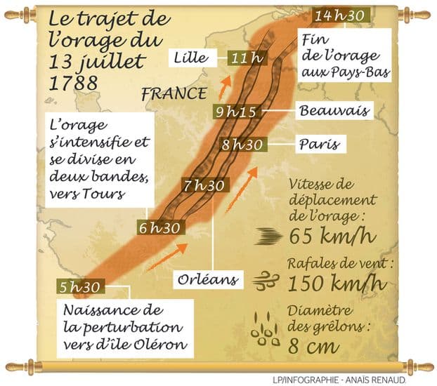 Cet orage fut néanmoins moins violent que celui du 13 juillet 1788. Lors de cette journée, une virulente dégradation orageuse concerna la France et notamment les régions situées de la Touraine aux Pays de la Loire et aux Flandres.