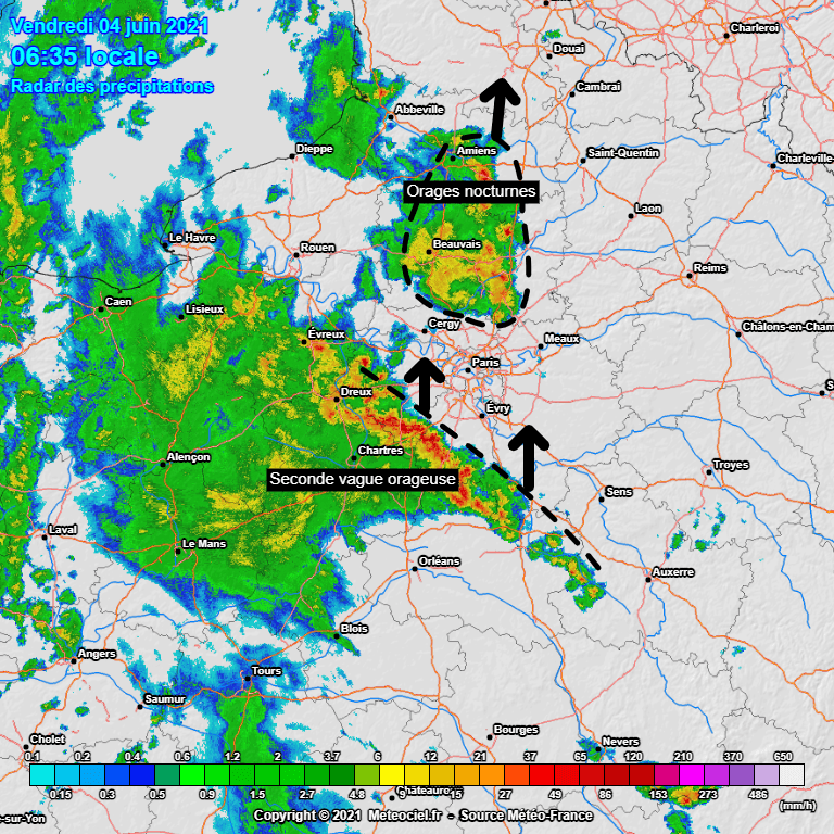 Image radar du vendredi 4 juin 2021 centré sur l’Île-de-France – via meteociel.fr, modifié par Météo-Villes