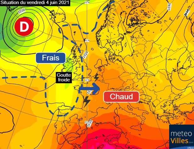 La goutte froide ondulant auparavant sur l’Atlantique s’est avancée de façon plus franche sur la France dès ce jeudi 3 juin au soir, induisant une instabilité croissante à l’avant, des Pyrénées au Nord du pays en raison de l’arrivée de l’air frais en altitude.