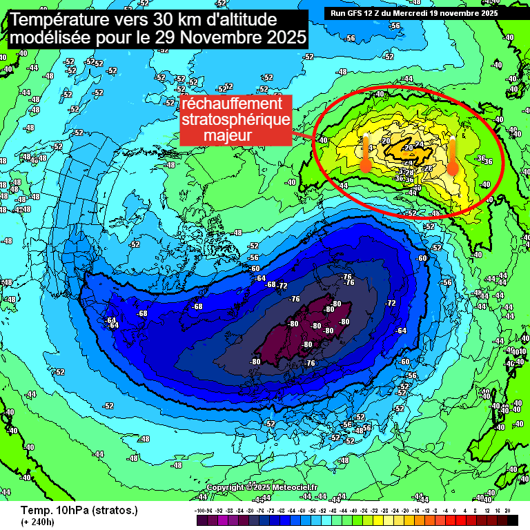 Réchauffement stratosphérique modélisé fin novembre 2025 - meteociel.fr