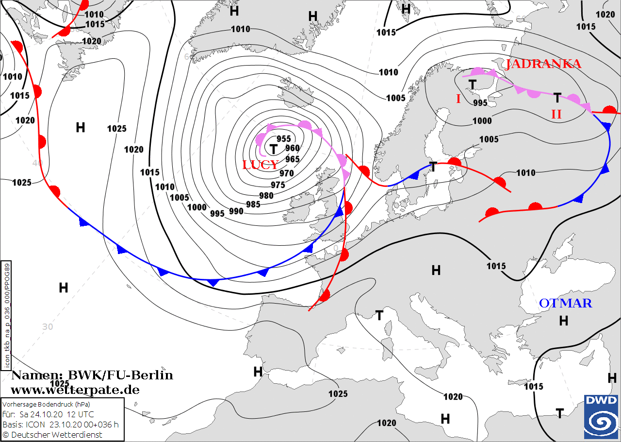 Noms des dépressions et anticyclones prévus pour samedi 24 octobre 2020 à midi (Berlin)
