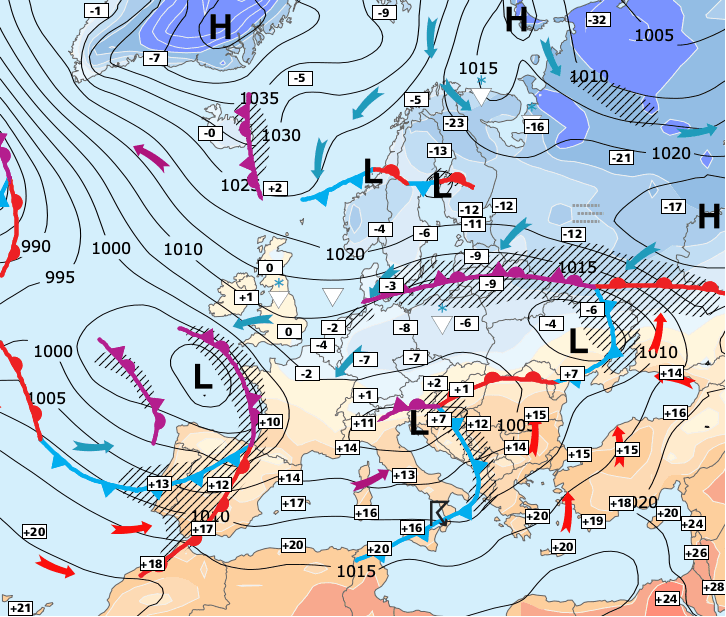 + Le conflit entre l’air glacial venu de Russie et l’air plus doux qui intéresse la partie Sud de l’Europe se situe entre la Loire et la Seine (d'où cette neige).