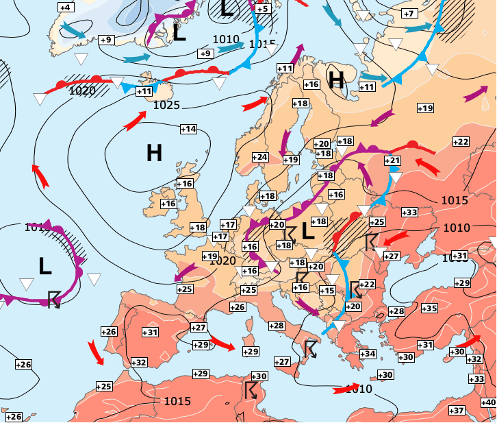 + Si un solide anticyclone écossais dirige de l'air stable et sec près des côtes de la Manche ainsi que de la façade atlantique aux régions méditerranéennes, la dépression polonaise véhicule au contraire des nuages et de la fraîcheur sur une bonne moitié Nord !