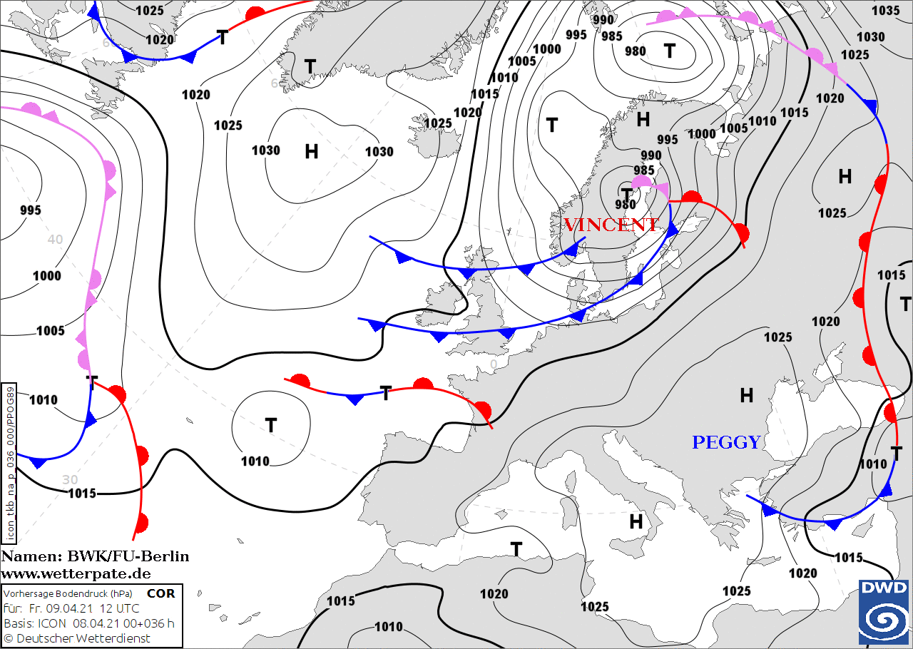 Noms des dépressions et anticyclones prévus pour vendredi 9 avril 2021 à midi (Berlin)