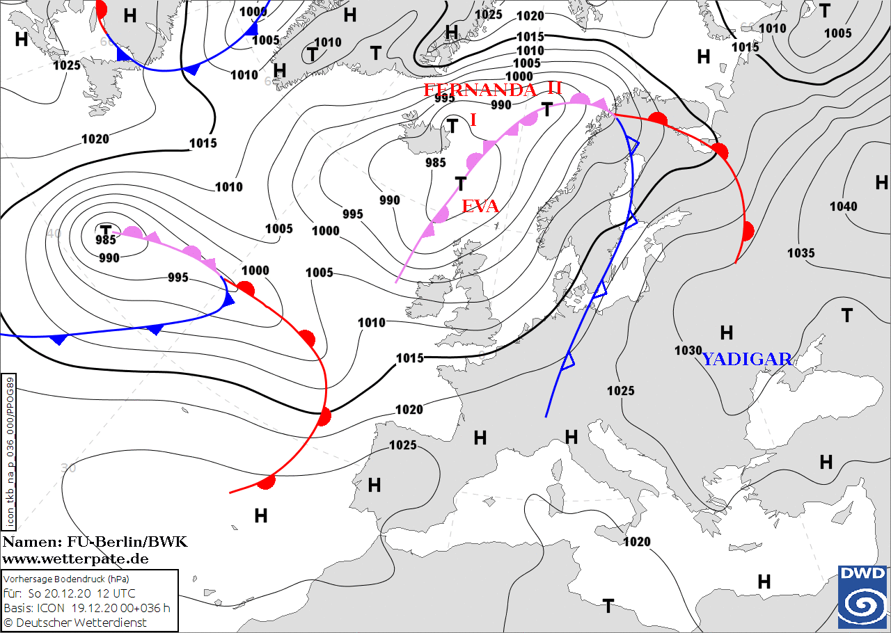 Noms des dépressions et anticyclones prévus pour dimanche 20 décembre 2020 à midi (Berlin)