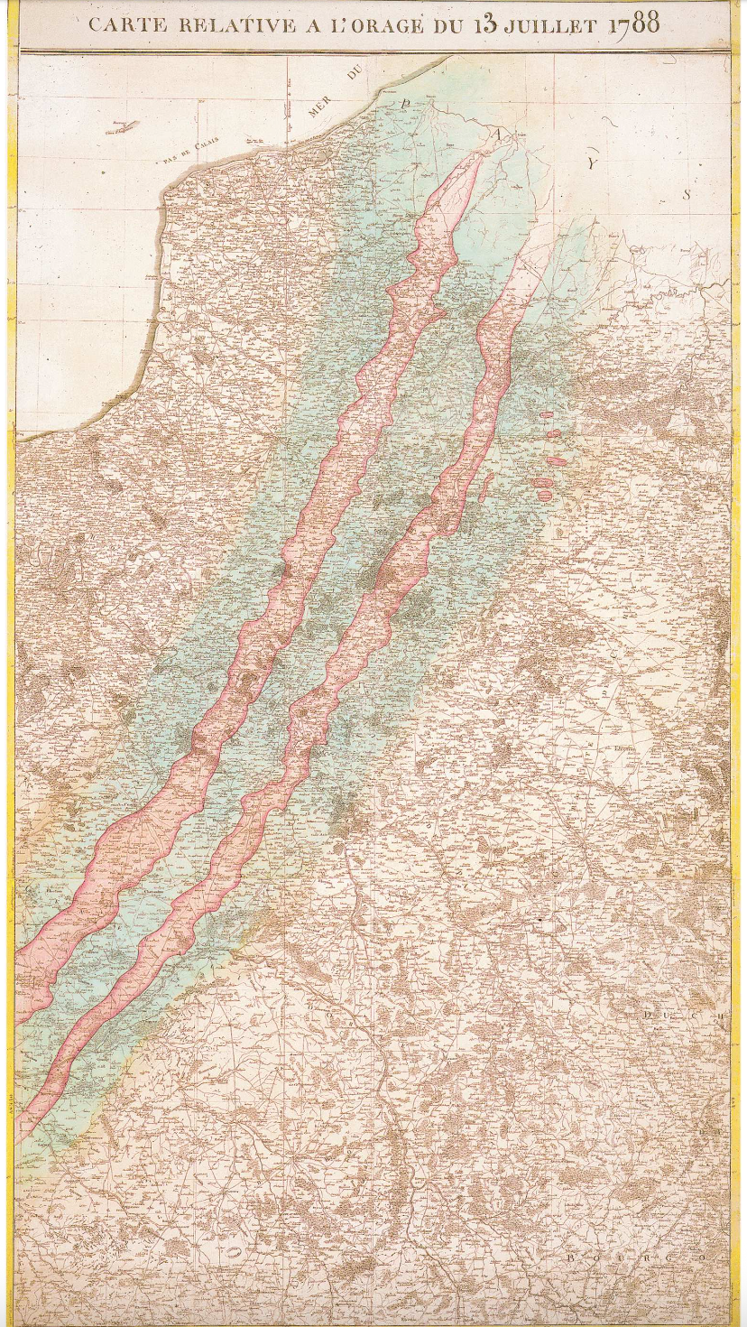 Trajectoire de l'orage à grêle du 13 juillet 1788 selon la Carte de Buache (1790)