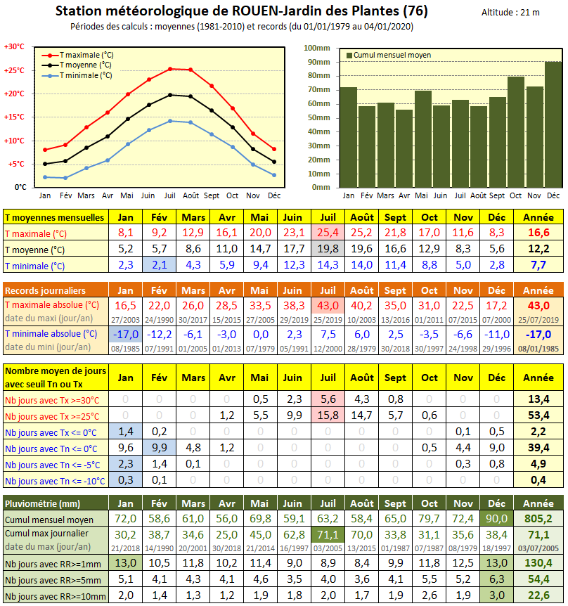 Principales données climatologiques de la station météo de Rouen-Jardin des plantes